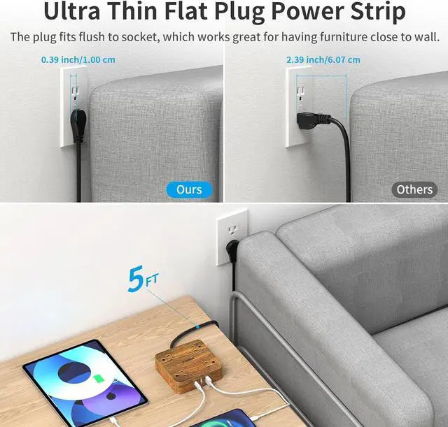 ULTRAL THIN FLAT PLUG: At just 0.39 inches thick, the flat plug is much thinner than traditional plugs, fits easily into receptacle tucked away behind your bed, dresser, a closed back desk, couch, and allows you slide the furniture flush with the wall. The extension cord is 5 FT long, easily putting plugs and USB charging ports in your arms reach. It also has a velcro wrap attached to the cord, so you can wrap up any extra cord you dont need.