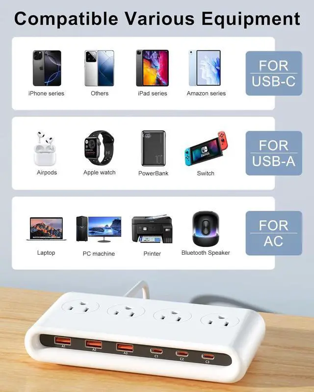 Durable and Safe: With a 1250W rated power output, this USB c charger strip also has grounded protection, over-voltage, over-current, and short-circuit protection built-in, keeping your devices safe and secure