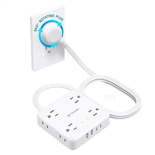 360° Rotating Flat Plug Power Strip: The 360-degree rotating flat plug ( 0.73 " thickness) allows you to adjust its angle freely, fitting snugly against walls or maneuvering in tight spaces without blocking other outlets or furniture. The compact design with a thin extension cord makes it portable and ideal for travel. US Patent No. 11901685