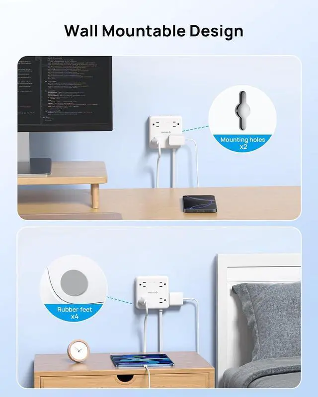 Wall Mount Power Strip: This mountable power strip features 2 mounting holes and 4 rubber feet, allowing you to securely install it on walls, desks, cabinets, or under counters without slipping. Wall-mount option keeps your workspace tidy and uncluttered. Come with 5 screws and 1 mounting template accrssories for easy installation