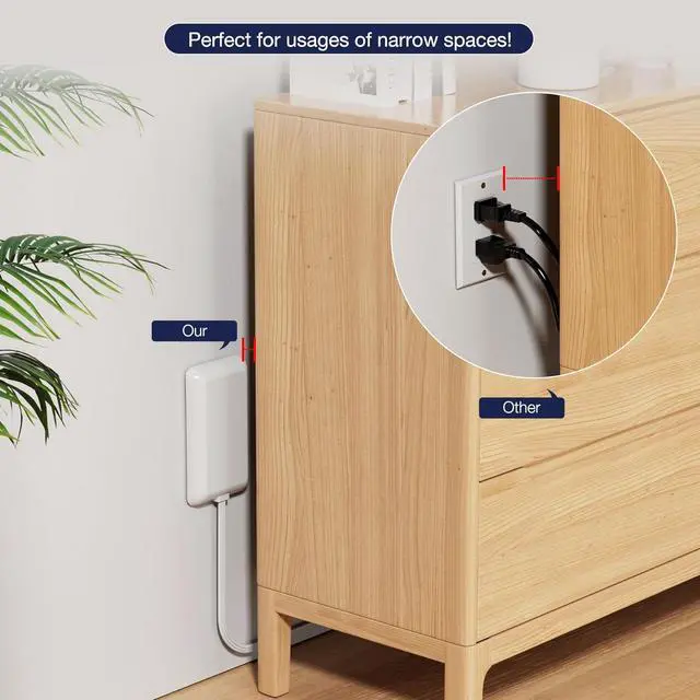 Great for small spaces flat plug power strip, features with ultra thin flat grounded 3 prong plug, flat and durable power cord, offers 3 standard outlets to meet to all your power requirements. Ideal for various home arrow areas like kitchens, bathrooms, bedrooms and living rooms;