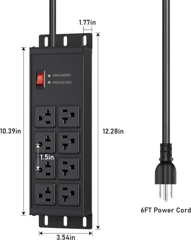 Amp: The center hole distance of AC socket is 1.57 inch, Providing enough space between the sockets to accommodate big plugs. Metal power bar was connected with 6ft 12AWG power cord, equipped with 20A high current, Rating: AC 20A 125V 60HZ 2500W. Reset On/Off power and 20A Circuit Breaker, Overload protection and fire protection coating