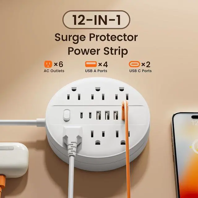 12-in-1 Multi Plug Wall OutletPower up to 12 devices effortlessly with this power strip with USB ports, featuring 6 AC outlets, 4 USB-A, and 2 USB-C ports. Designed for home offices, dorms, or travel, this surge protector outlet extender eliminates clutter by replacing multiple adapters.