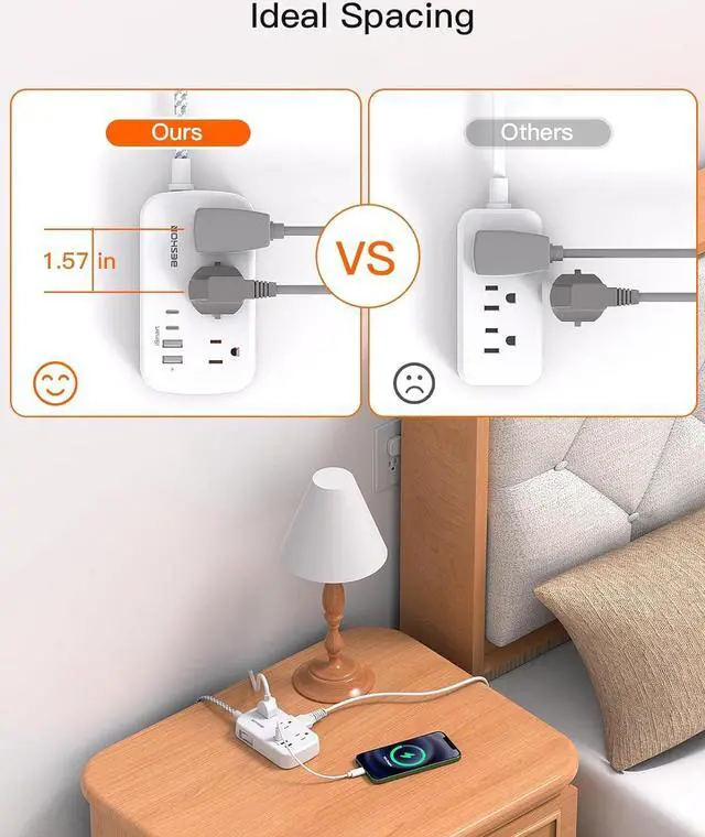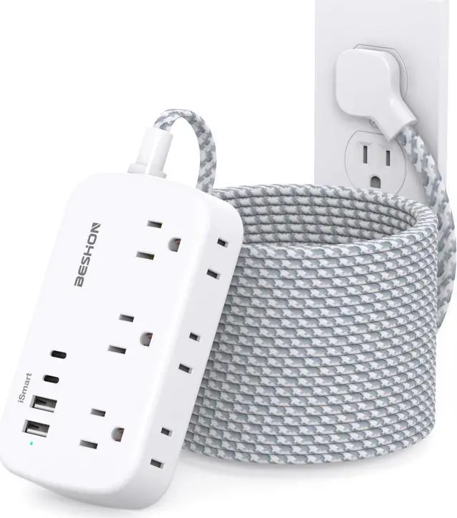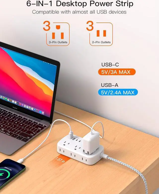 10-in-1 Power Strip with USB PortsFlat extension cord could turn 1 socket into 6 outlets 2 USB-A and 2 USB-C, which could charge up to 10 devices at the same time. Compatible with your cellphone, laptop, tablet, earphone, or cameras without a variety of converters, keeps your desktop organized, must-have accessory for the college dorm room, home, office, bedroom, kitchen etc. and this mountable power strip can be fixed on the wall or desk by 2 keyhole slots on the back.