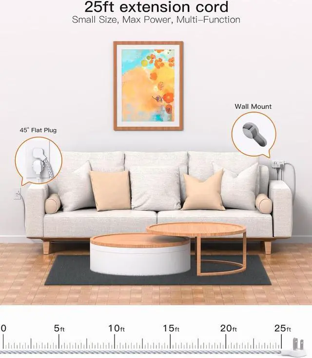 25 ft Extension Cord with Flat Plug This long extension cord with 25FT is long enough to make it more flexible, flat plug design indoor extension cord with USB can fit easily in tight spaces, such as a desk, or nightstand; 45 degrees right-angle create enough room makes this USB power strip flat plug does not obstruct other plugs, suitable for installing behind sofa, wardrobe, bookshelves, and other furniture. The braided power cord is not easy to deform, is durable, and more safer.
