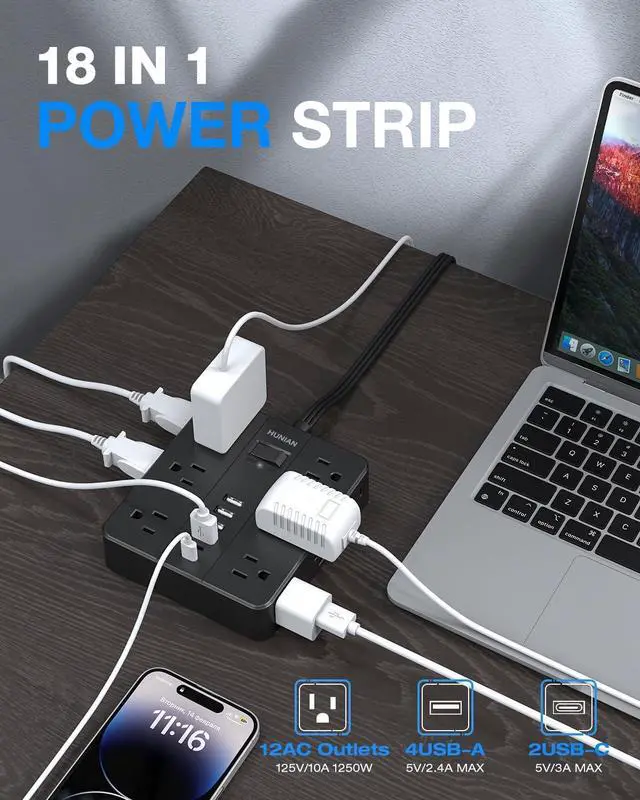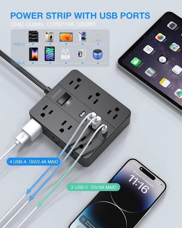 USB: This flat plug power strip could turn 1 socket into 12 AC outlets and 6 USB ports, 1.65 inchces widely spaced in between outlets, fit big adapters without blocking each other, keep your desktop organized; You can use it in any indoor place such as home, office and dorm room