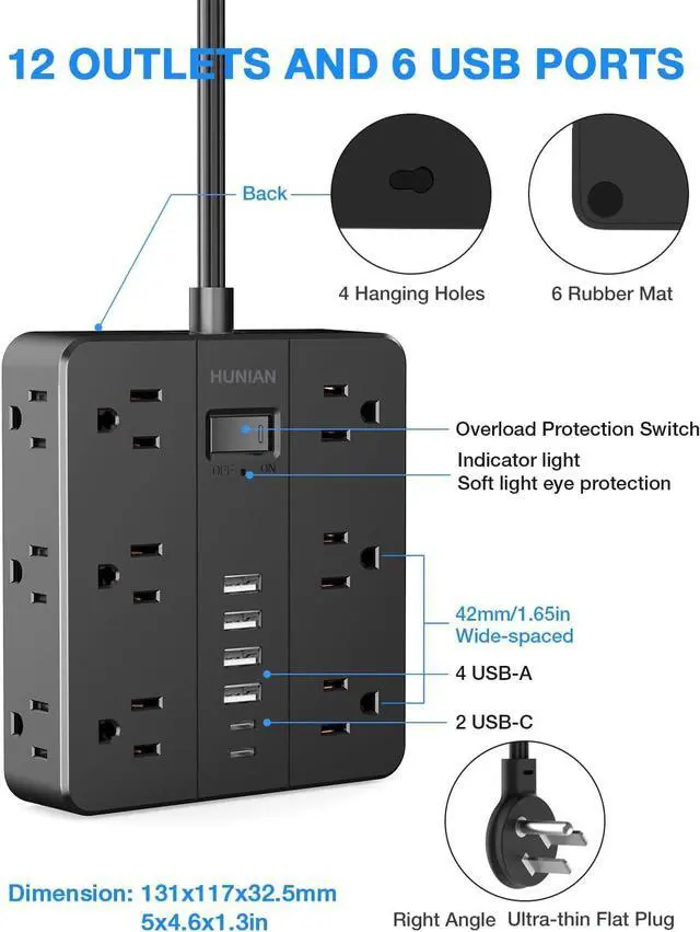 Multiple Safety Protection Power Strip: This power strips with surge protection is lightning protection, overload protection, and fireproof; An integrated circuit breaker will trip off automatically to protect your devices while the power overloads