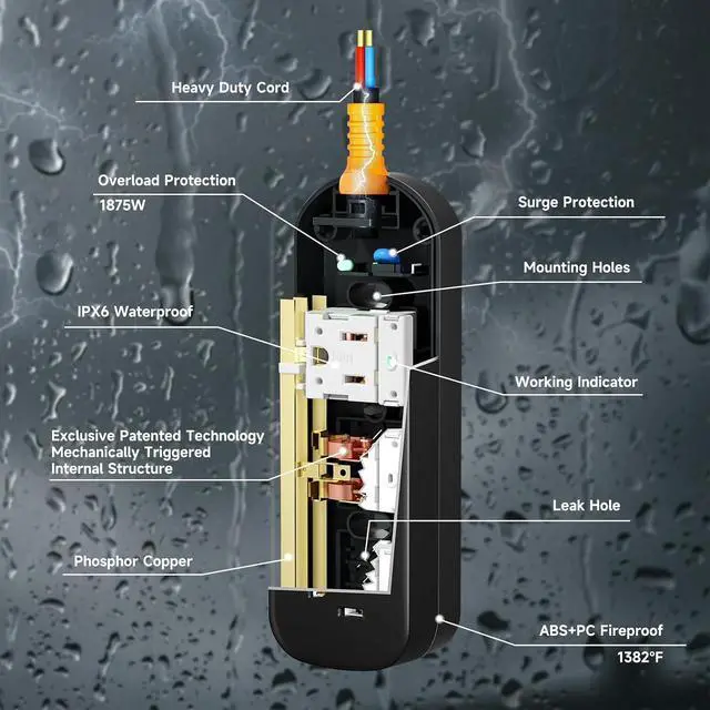 All-round Safety Design The built-in circuit breaker can automatically shut off when overload, preventing overload-caused fire. The casing of the outdoor outlet strip is made of 1382°F heat-retardant ABS+PC material, fireproof.