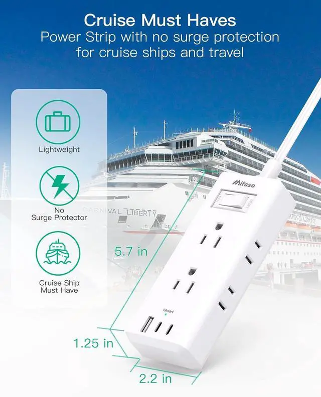 Travel Essentials & Cruise Accessories Must Haves: The cruise power strip with NO surge protection, it' s an absolute must have for home and cruise ship accessories as cruise lines require that power strips have NO surge protection. Our travel power strip is more portable than a regular power strip. Compact and lightweight, easy to carry, and perfect for travel.