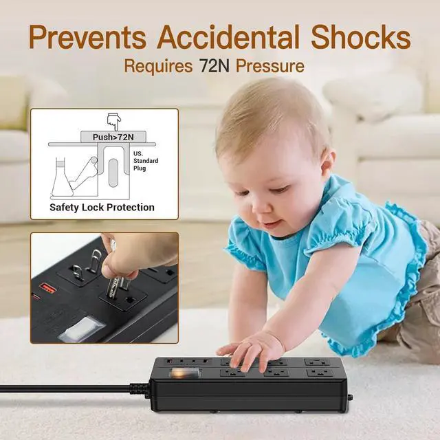Advanced Safety Features: Includes a patented safety lock mechanism that requires over 75N of force to open, preventing accidental electric shocks from objects like forks, keys, or children' s fingers. Comes with 9-point safety protection, including surge and overload safeguards.