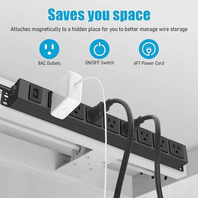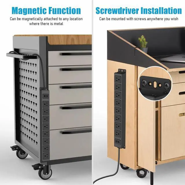 Magnetic Mountable Power Strip: This power outlet is designed with a magnetic mounting feature that allows it to be mounted on metal surfaces without drilling. There are 4 screws included in the package so you can mount it anywhere you want. There are multiple mounting options to choose from, which is a nice feature.