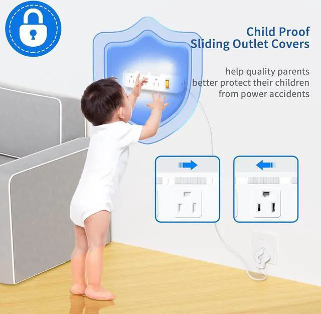 Child Safety Sliding Outlet CoverEach outlet of this portable power strip set with a slide-to-lock cover, protect baby away from accidental electric shock and keep unused outlets closed from dust even a little water. Help quality parents better protect their children from power accidents.
