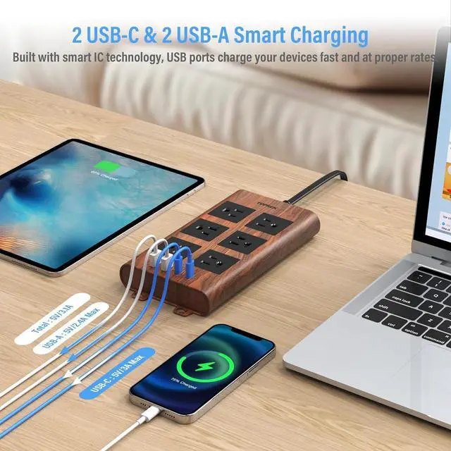 [4 SMART USB PORTS] - This power strip features 2 USB-C ( 3.0A max) and 2 USB-A ( 2.4A max) ports, eliminating the need for bulky adapters and freeing up outlets, let you can charge phone, tablet and other USB-powered devices directly. With built-in smart IC technology, it automatically detects connected devices and delivers the optimal charging speedperfect for phones, tablets, and more.