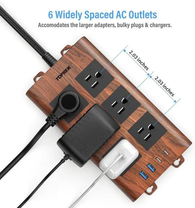 [SIX WIDELY SPACED OUTLETS] - The spacing of the electrical outlets is 2.03 inch, wide spaced receptacles to accommodate larger transformers and AC adapters/ wall wart to work side-by-side, without blocking the adjacent outlets, as compared to traditional long designed power strips and all the USB outlets will prevent you from needing the wall inserts!
