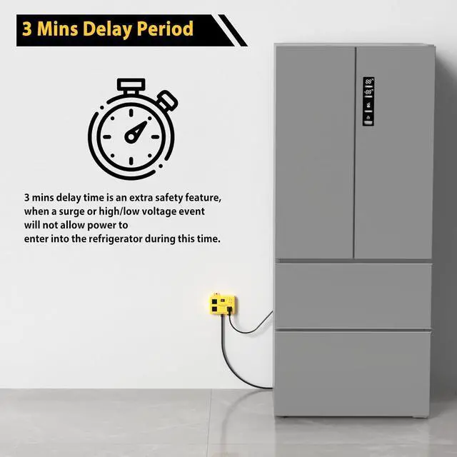 3 Mins Delay Period: Sometimes multiple voltage surge may occur within one minute. A short-term delay surge protector can cause the refrigerator power cycling quickly, potentially causing significant damage to the compressor. To protect your valuable home appliances, we recommend using HEZI appliance surge protector with 3-minute delay and voltage changes of 0.5 seconds detection time.