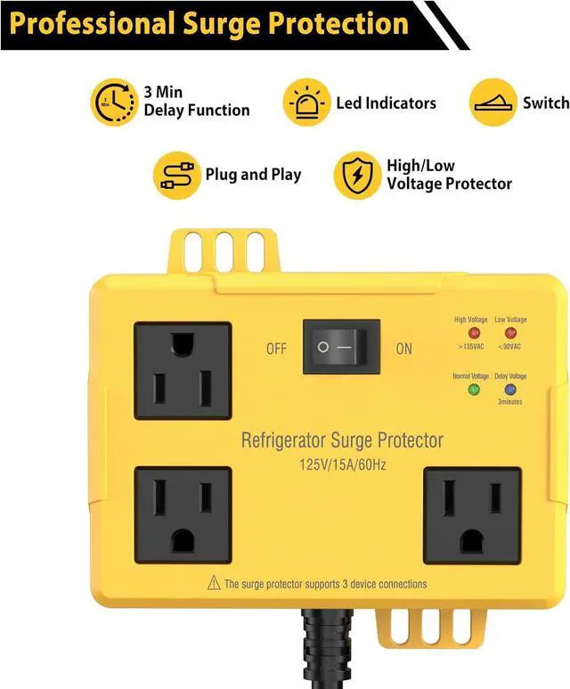 15Amp Electronic Voltage & Surge Protector Combo: 3-in-1 surge protector can up to protect 3 electrical appliances at the same time, besides the refrigerator, also can plug in other appliances at the same time such as microwave, water cooler, dishwasher, washing machine etc. that save your procurement cos! 125V/15A/60Hz/1850W.