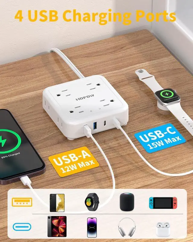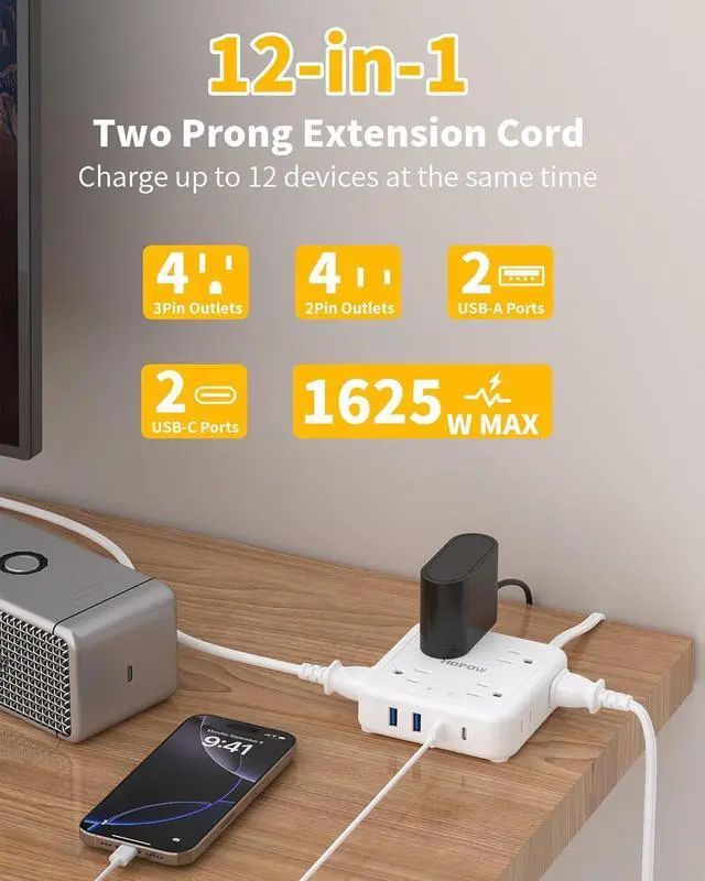 12-in-1 Outlet StripThe 2 to 3 prong outlet adapter features 8 AC outlets (Max 1625W), 2 USB-A ports (5V/ 2.4A, 12W), and 2 USB-C ports (5V/ 3.0A, 15W). It intelligently allocates power for USB devices like phones, tablets, and headphones, charging up to 12 devices simultaneously.