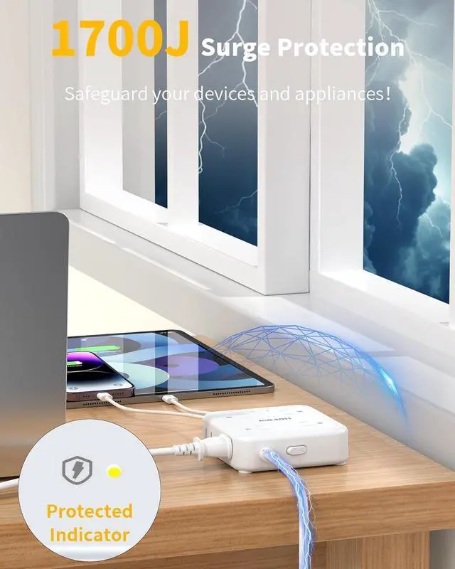 Overload Safety & 1700J Surge ProtectionThis 3 prong to 2 prong adapter offers 1700-joule surge protection and 7 safety (overload/overcurrent/short circuit/overvoltage). Its built-in 13A overload protection switch automatically shuts off power when exceeding 1625W, keeping your devices safe without needing to unplug.