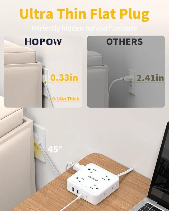 Space-Saving Flat Plug & 5FT power cordFeaturing an ultra-thin 0.33 -inch low profile plug with a 45° angled design for easy placement behind furniture. The 5-foot polarized extension cord two prong lets you position your power strip discreetly while ensuring it can reach your devices.