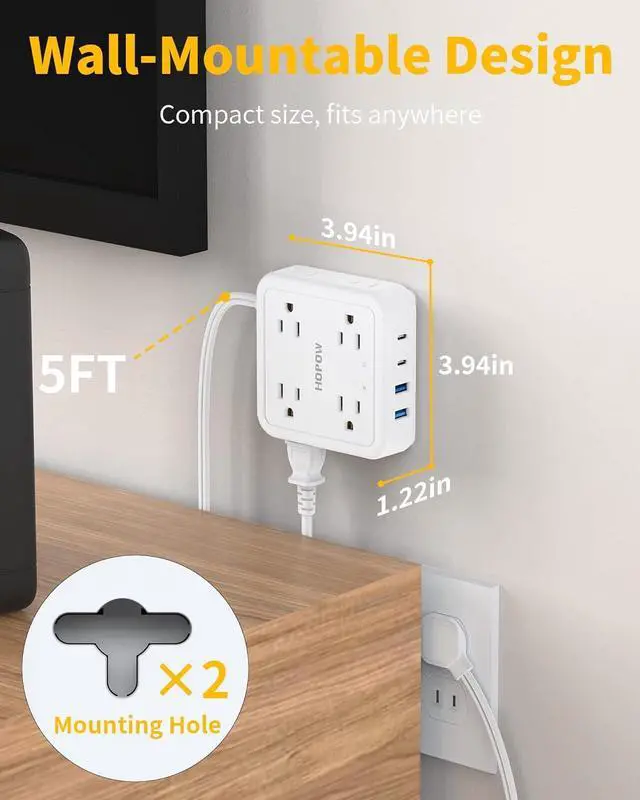 Wall-Mount Design The two mounting holes (with screws) on the back of the 2 prong surge protector allow you to securely fix the product to the wall for easy access. The 4 rubber feet on the bottom prevent slipping, maximizing space efficiency in bedrooms, offices, or old house.