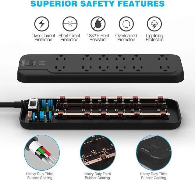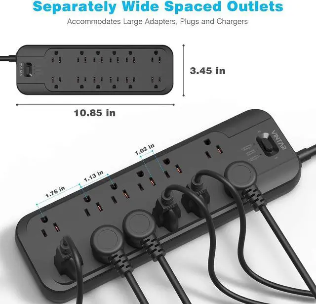 Full-Round Protections: VINTAR power strip flat plug is made of high strength fire-resistance PC shell, making it fireproof up to 1382 F (750). High end solid capacitors ensure complete protection against electrical short circuit, over heat, over charging, over current and over voltage danger. The lighted on/off switch with integrated circuit breaker offers power control and overload protection over all outlets when the ampere is over 15A