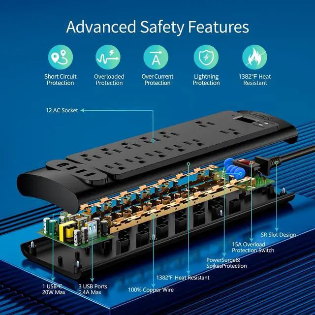 Superior Safety-- Advanced surge protection (2980 Joules) and overload protection, combined with a fire-resistant casing and safety switch, keep you and your devices safe.