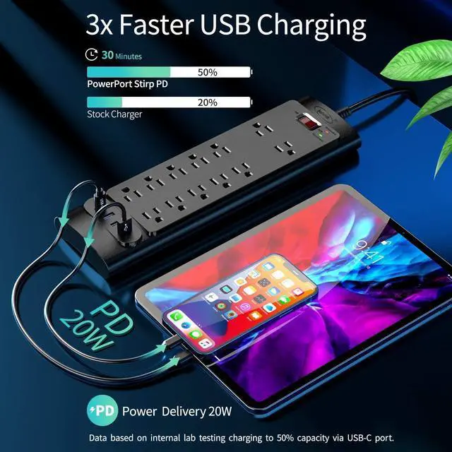 5.5FT 16 IN 1 Power Strip -- 12 AC outlets (Total 1625W) and 4 USB high-speed charging ports enable you to power up 16 devices simultaneously. Use the 20W USB-C port for iPhone 15 a high-speed charge from 0-50% in just 26 minutes, Each USB port can detect and deliver an ideal input current of up to 5V/ 2.4A (the actual current is decided by the demand for the devices)