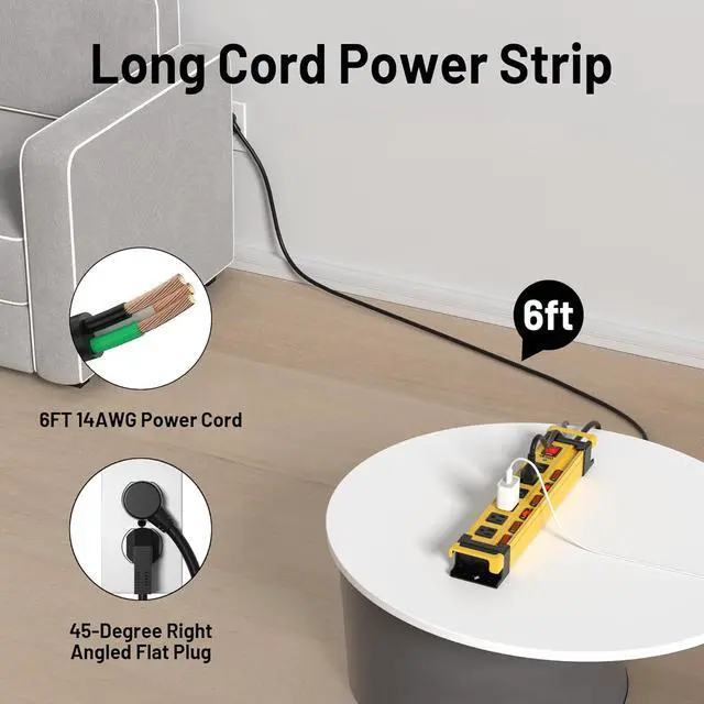 Metal Heavy Duty-- This mountable power strip made of extra-thick aluminum alloy housing with 14 gauge extension cord. Long power cord and 1.69 inches wide spacing outlet and 45°right angled flat plug make this 6 outlet strip easy to use and move around.