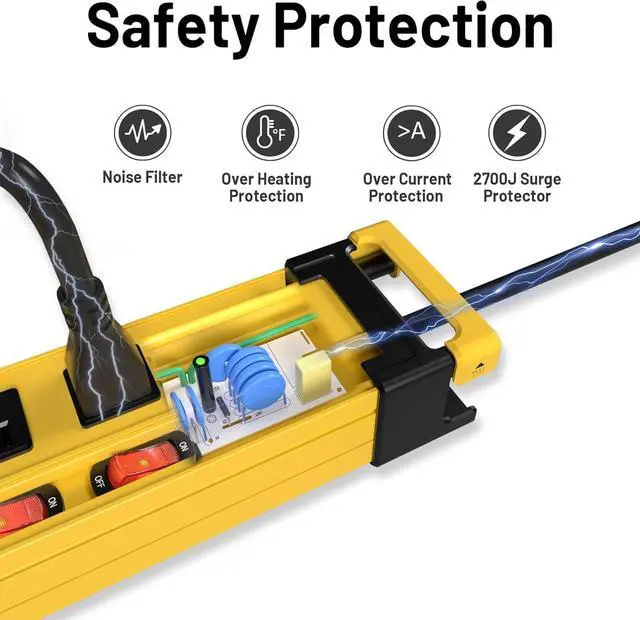2700J Surge Protector-- This heavy duty power bar has 2700 joule surge protector and auto shutdown fuse, built-in EMI to protect your devices from damage by spikes and over current. Abnormal conditions can be detected immediately and automatic shut down to prevent the metal power strip, providing more comprehensive and maximum protection.