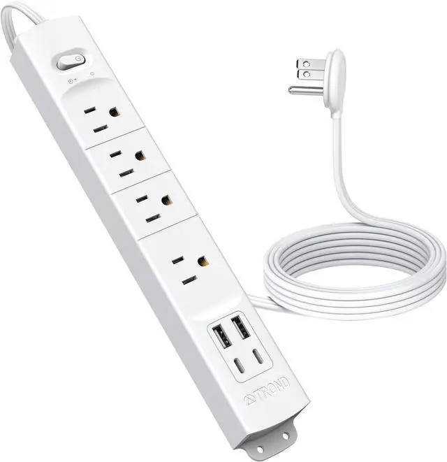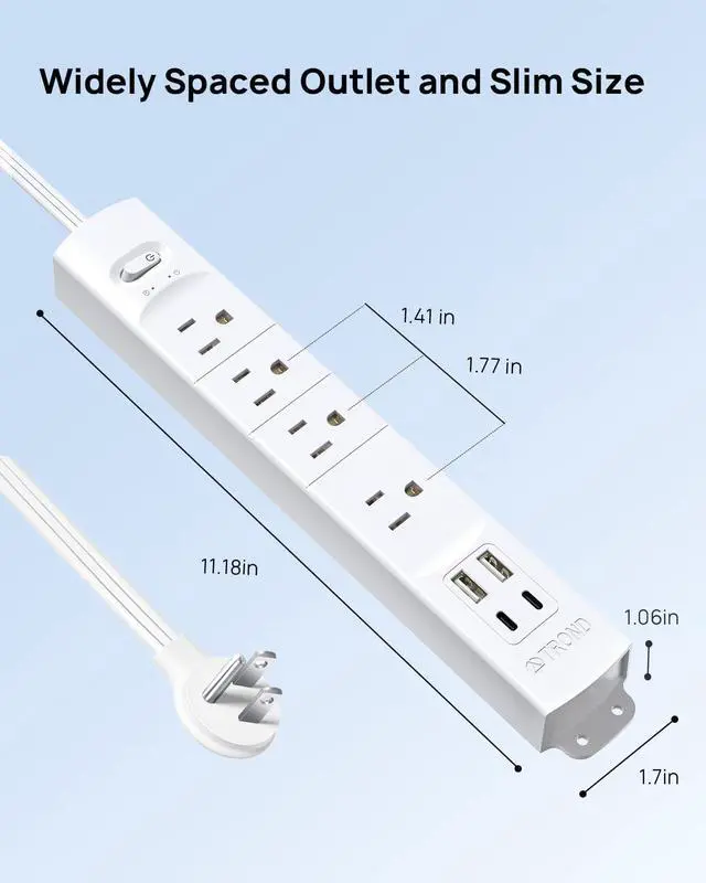 Space-Saving Design - The power strip designed with an ultra-flat plug and flat extension cord, allows you to place any furniture against the wall, the plug with a 45° angled design will not block the bottom receptacle of your duplex wall outlet, 2 holes on the back and 4 holes on the side allow you to fix the surge protector on the wall in any way