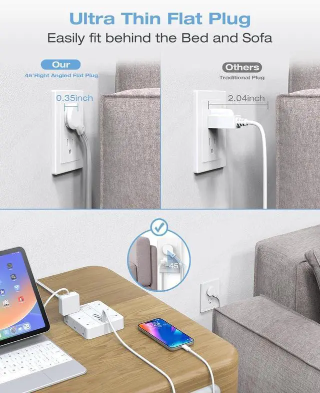 18-in-1 Flat Plug Power StripWith 12 AC outlets and 6 USB ports (4 USB-A and 2 USB-C), this Multiple Outlet Power Strip allows you to charge up to 18 devices simultaneously, Ideal for home offices, dorms, and other indoor spaces, it ensures that your devices stay organized and charge
