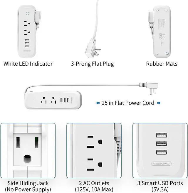Big Expansion & Advanced Charging Technology - NTONPOWER USB power strip features 2 AC outlets (1250W/10A) and 3 USB ports for fast charging (5V/ 2.4 Max Each Port, Total 3A/15W) delivers an optimized charge to USB devices using NTONPOWER' s top-notch N-Smart charging technology which can provide power and charging for up to 5 devices from a single wall outlet.