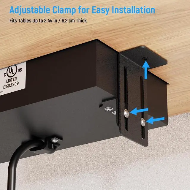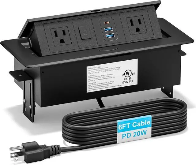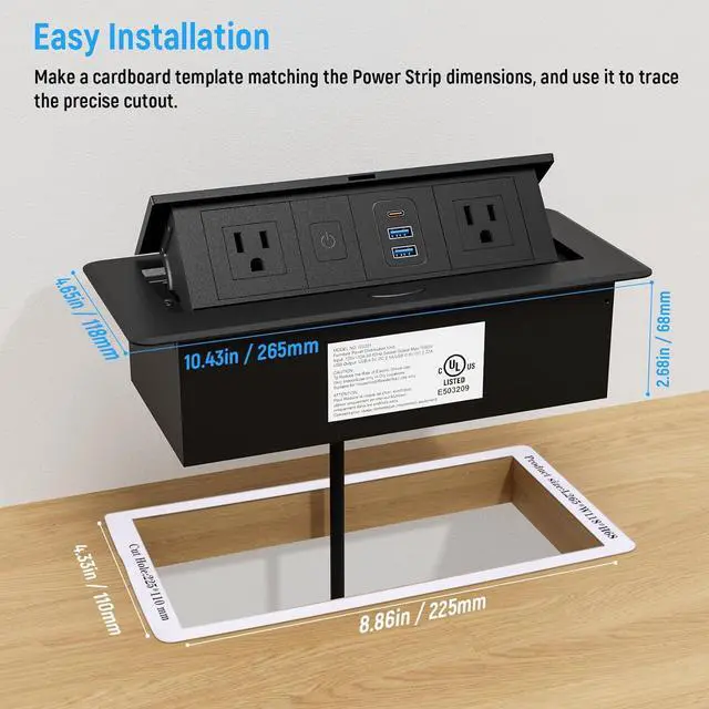 Installation-friendly: Mark the hole size on the table with the cardboard template, cut a hole in the table surface (Hole size: 8.86 in / 225mm x 4.33 in / 110mm), insert the power strip into the hole, install the brackets, Press the button to pop up and use the power strip