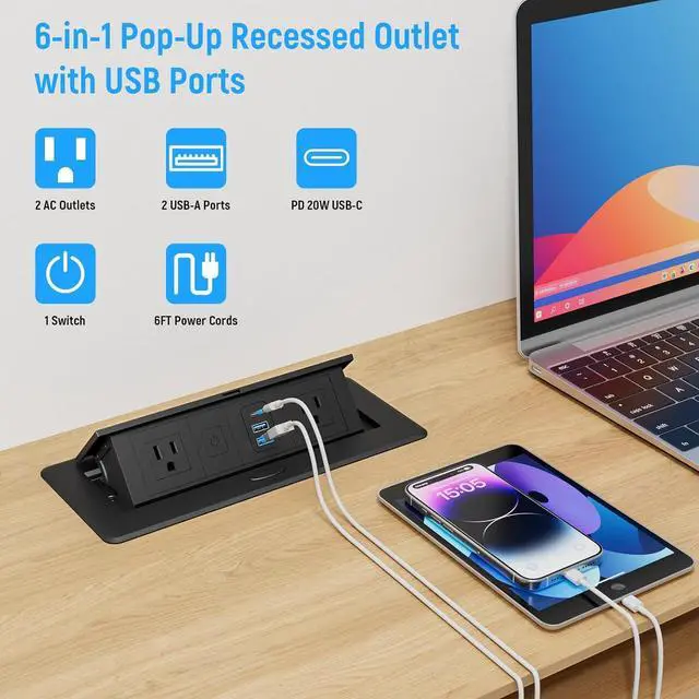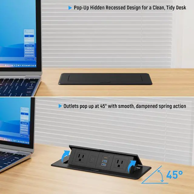 45-Degree Soft Pop-Up: This outlet box with a 6ft power cord pops up smoothly at 45 degrees when in use and hides away when not needed, offering a clean, discreet power solution.