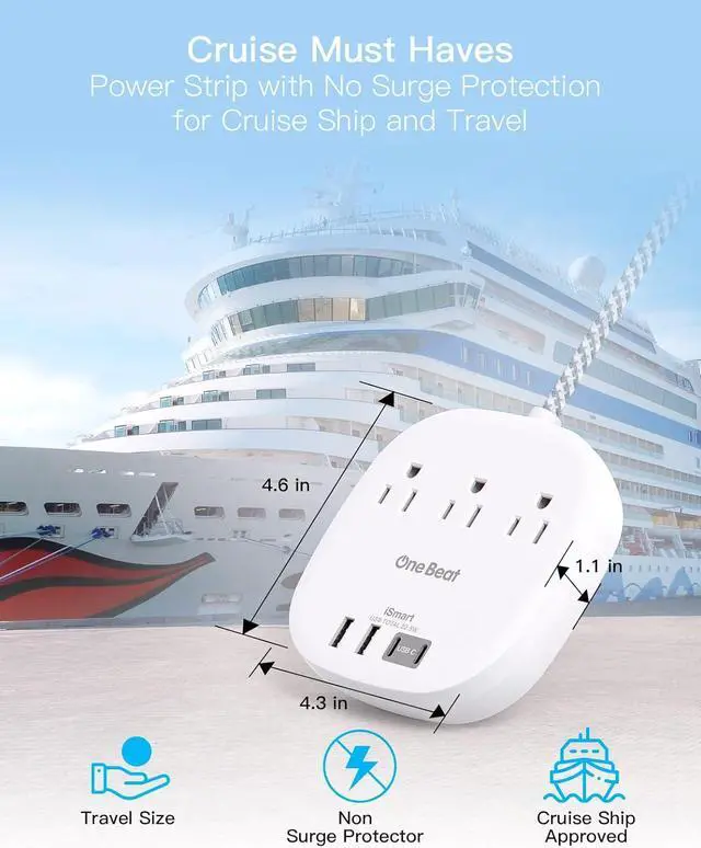 Cruise Accessories Must Haves - The small cruise power strip with NO surge protection, it' s absolutely a must have Home and Cruise Ship accessories as Cruise lines require that power strips DO NOT have Surge Protection. Compact and lightweight, easy to carry and best for travel.