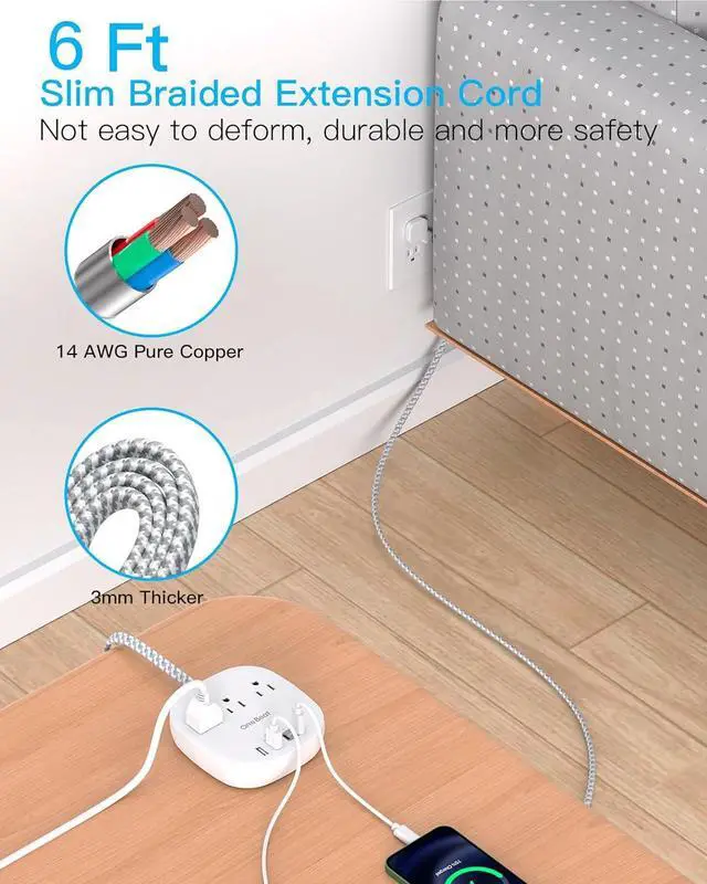Right Angle Ultra Flat Plug & 6 Ft Braided Extension Cord - With only 0.35 inch ultra thin plug and 45 degree right angle design, which is much slimmer than traditional plugs, can close to the wall easily and hide in the back of furniture, no waste for outlet and space. 3mm thicker extension cord is made of pure copper, which has better current carrying capacity (15A). The braided power cord is not easy to deform, durable and more safety.