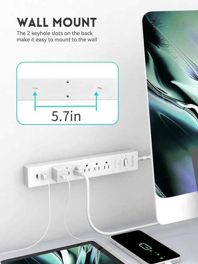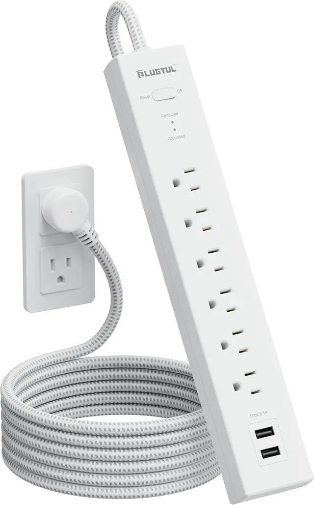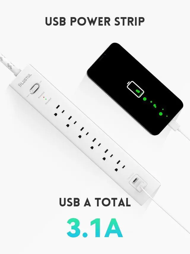 Power strip with USB Ports 6 AC outlets(125V/15A/1875W), 2 USB-A ports(Total 3.1A ) to power up to 8 devices simultaneously. Perfect for your home, office, garage and anywhere multiple devices need power.