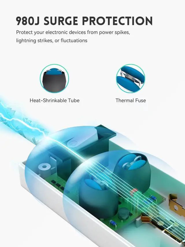 980J Surge Protection This (980 Joules) surge protector power strip with 3-line surge protection (lineneutral, lineground and neutralground) to protect your electronic devices from overload, short circuits, power spikes, lightning strikes, or fluctuations.