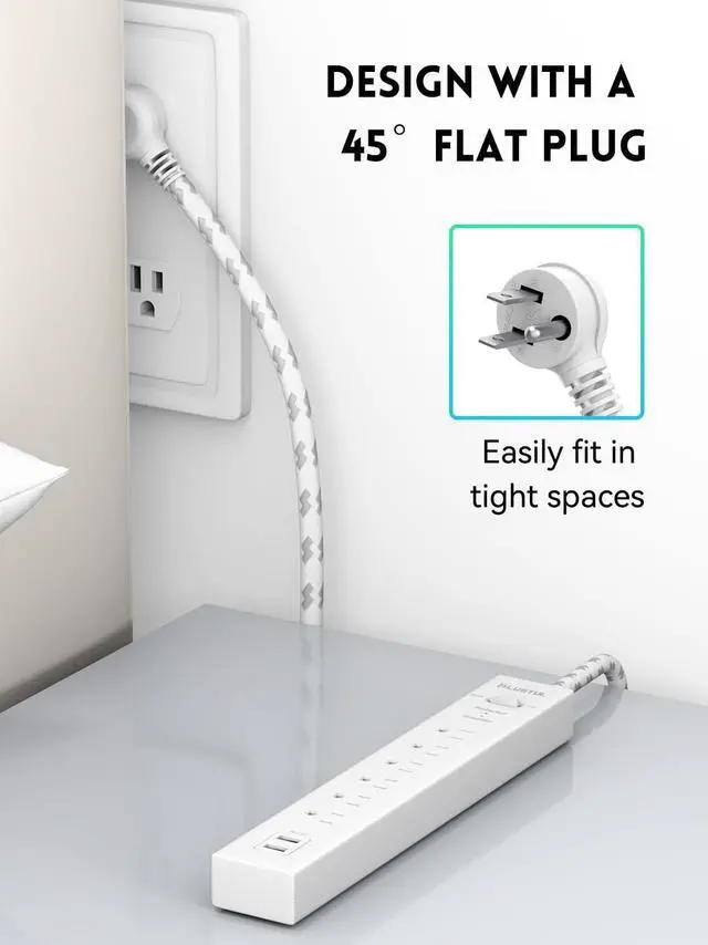 Flat Plug & Wall Mountable The 45° flat plug design is great for stashing under or behind furniture. Two screw-mounting tabs allow this wall-mount power strip to be securely installed on the wall and workbench.