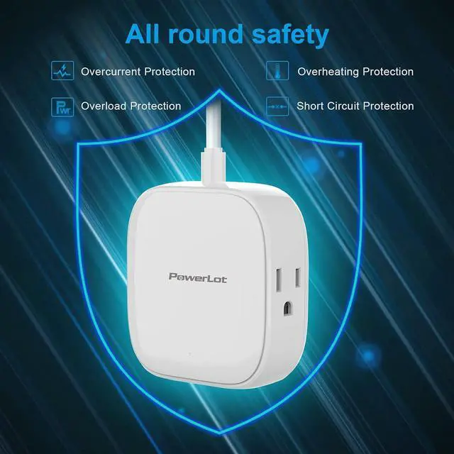 [Portable Size & Flat Plug] PowerLot designed this mini power strip as a compact square whose size is just 50% of an iPhone 12 to save more space on your desktop or when carry in a travel pag, while a slimmer 45° angled flat plug power strip could fit in narrow space without blocking other wall outlets; Aways provides you with convenience.