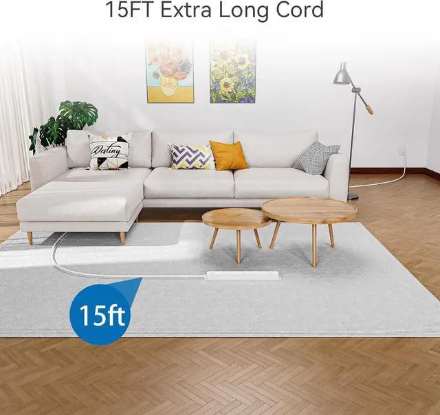 Long Cord Power Strip: The long 15ft power strip gives you flexibility to reach distant outlets and hard to reach places. The right angle plug easily fits in tight spaces like behind furniture, desks or anything which is close to the wall not allowing you to use the standard Plug.