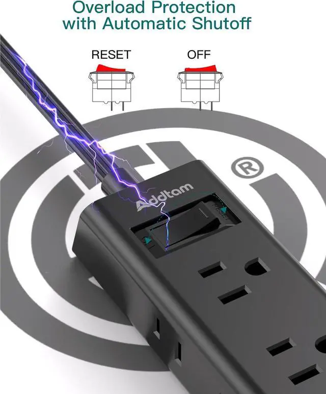 Multi Safety Protection- ETL Certificate. This extension cord with multiple outlets has ON/OFF switch overload protection, short-circuit protection, over-current protection, over-voltage protection, and overheating protection. It will automatically cut power to protect connected devices when voltage surge is overwhelming