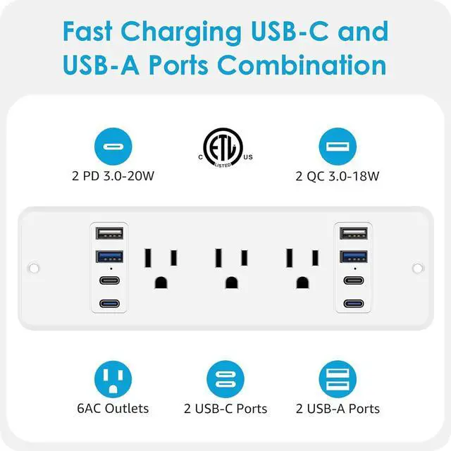 20W Fast Charging Surge Protection: 6 Outlets Output rating 10 Amp / 125 Volt / 1250W. Come with fast charging QC 3.0 18W Max USB-A port and PD 3.0 20W Max USB-C port. Suitable for many different devices.