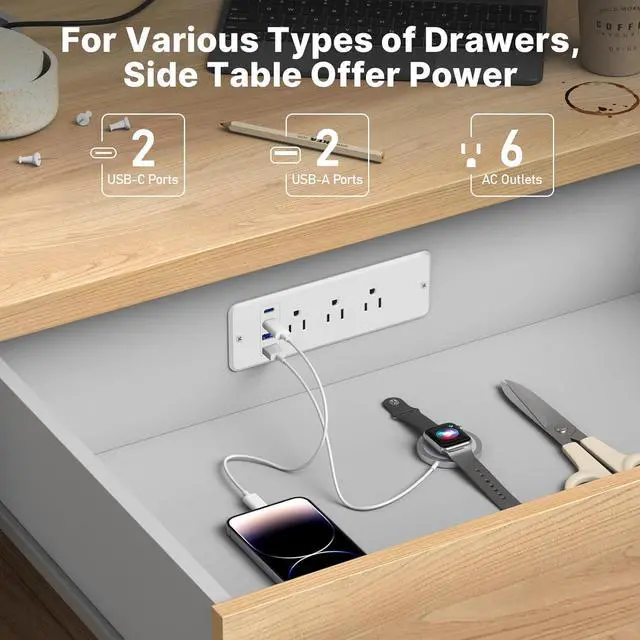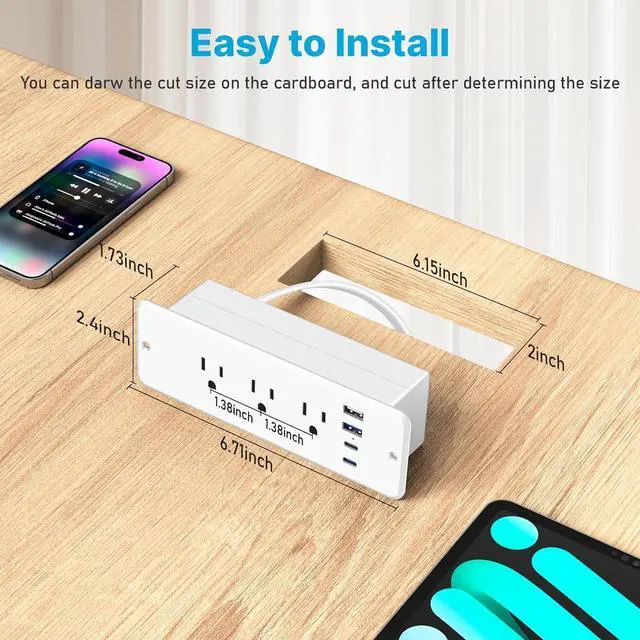 Dual side compact recessed power strip built in 6 outlets and 36W QC 3.0 USB A and 45W PD 3.0 USB C, You' ll get twice as many power ports in the same space! Also reduces the number of power strips under your desk and helps manage cables. Can power laptop.
