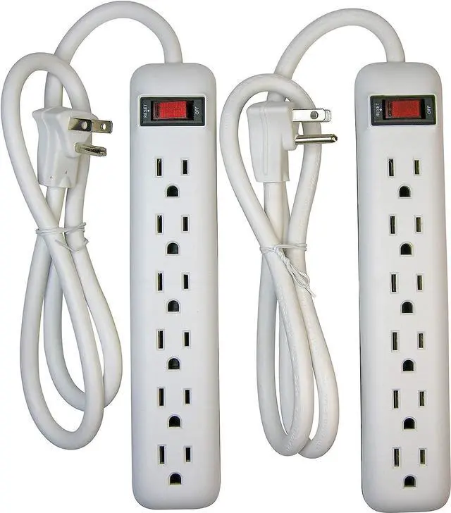 Two- 6 Outlet Power Strips Includes a 3 Foot Cord Built in Circuit Breaker protects against overloads & a Lighted On/Off Switch Slim plug allows furniture to sit closer to wall Total Outlet: 6