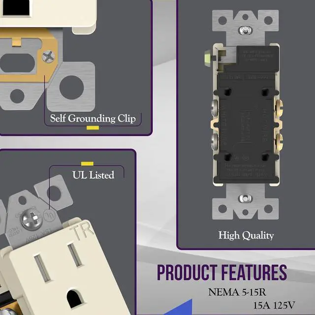 Complies with 2011 NEC Article 406. 14 for tamper-resistant receptacles. 15A 125V, 5-15R, self-grounding, 2-pole, 3-Wire. UL94, V2 Rating, 1- year, UL Listed