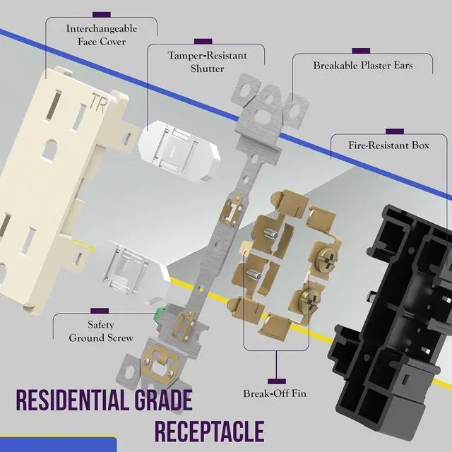 Tamper-resistant (TR) receptacles prevent unwanted objects from being inserted. High impact-resistant polycarbonate thermoplastic cover and body for long service life