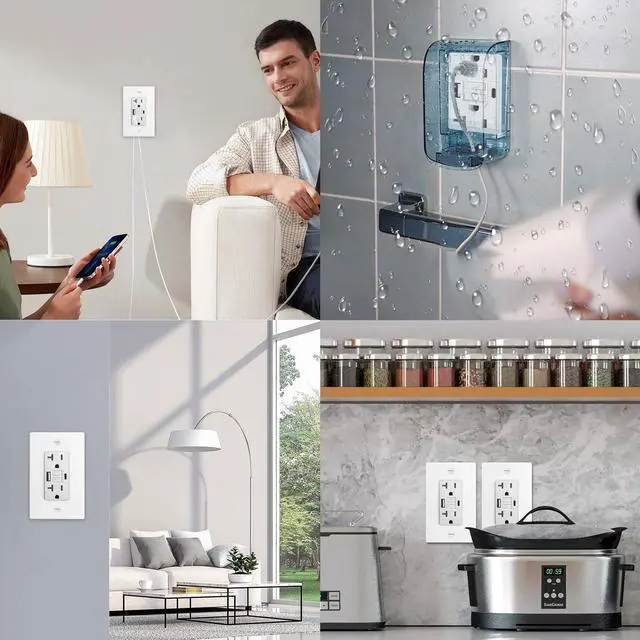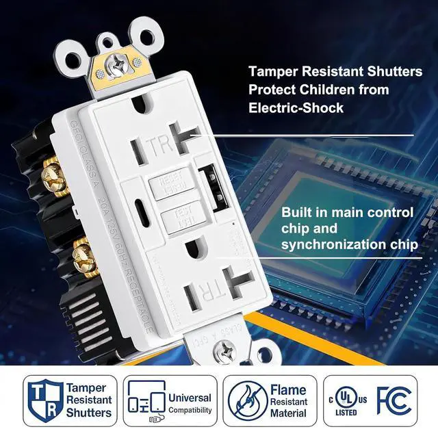 Tamper Resistant Outlets: The USB wall outlet features tamper resistant shutters to prevent accidental insertion of objects or accidental contact by children. Improved safety and compliance with NEC requirements.