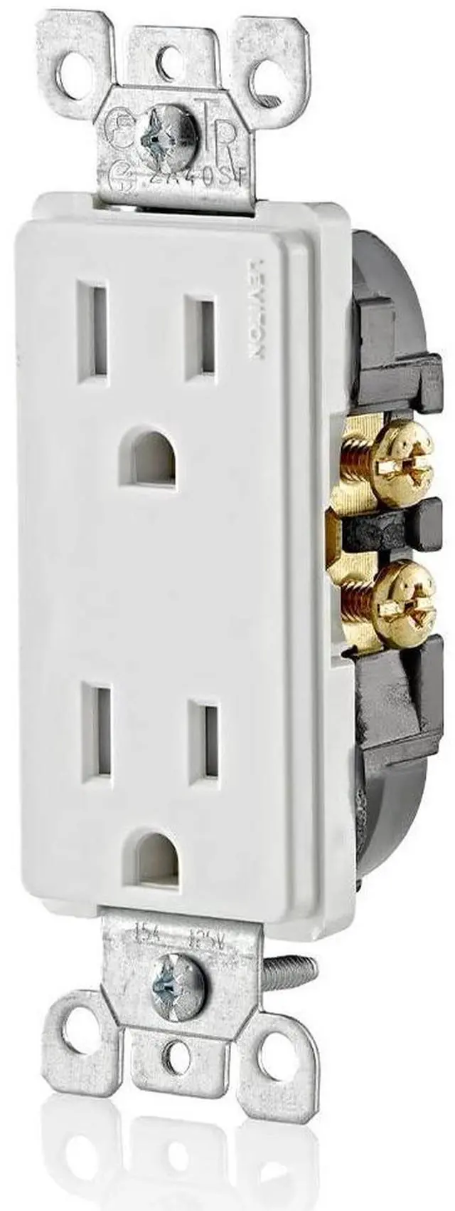 Shutter mechanism inside the receptacle blocks access to the contacts unless a two-prong plug is inserted, helping ensure hairpins, keys, etc., will be locked out