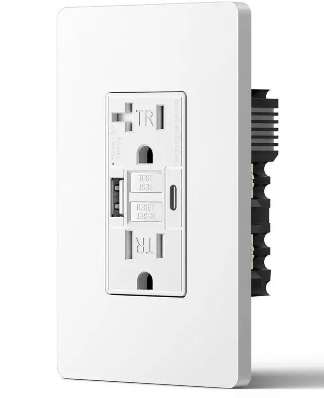 [-- ] Integrates a GFCI Outlet 15 AMP with USB ports (Type-A & Type-C), providing up to 5V/ 4.8A combined output; easily charge smartphones, tablets, laptops, and toothbrushes without extra adapters